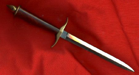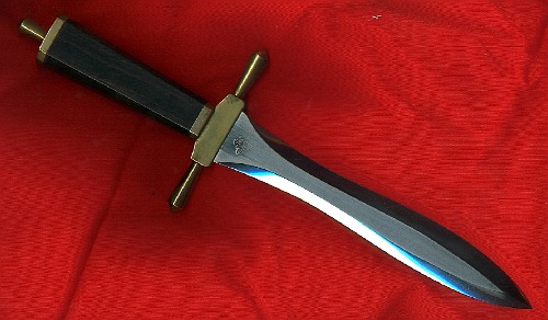 | Large Brass Fitted Dagger The blade is 9x1.5 inch long of 3/16 thick 440C stainless steel at 58 RC, the handle is 4.625 inches long. The handle is of African Black Wood. The fittings are brass. The overall length is 15 inches The price is $825.00 |