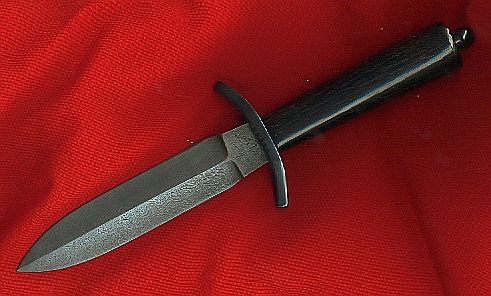 | Damascus Bladed Dagger The blade is 5.5x1.125 inch long of 3/16 thick random pattern damascus steel, the handle is 4.125 inches long. The handle is of Oryx horn. The fittings are black oxide iron. The overall length is 10.425 inches The price is $645.00 |